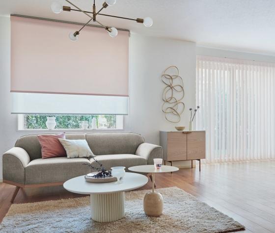 [左]ラルク ダブル 手前生地:RS-1120 ミスト(コーラルピンク) 奥生地:RS-1615 シフォン(ホワイト) 部品色:マットホワイト