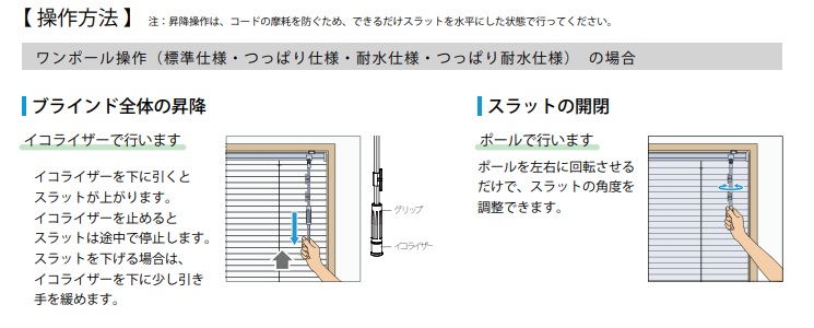★ワンポール操作について 昇降コードをポールの中に隠し、すっきりシンプルなデザインを実現。 製品の昇降とスラットの開閉を 1 本のポールで操作します。 ループ状のコードがない安全安心な設計です。
